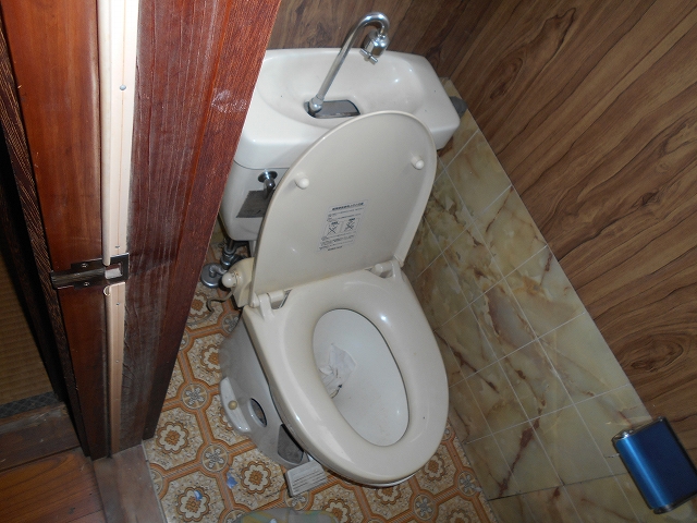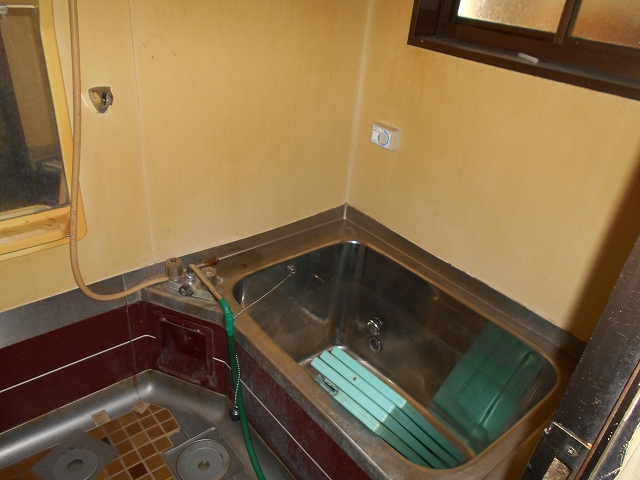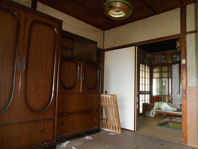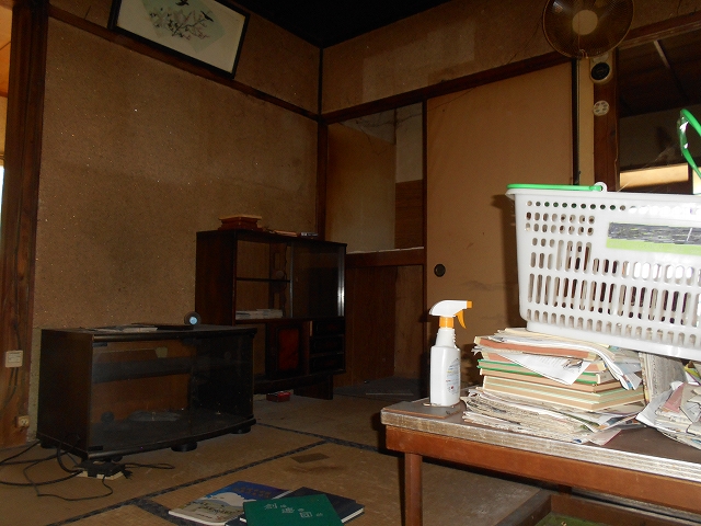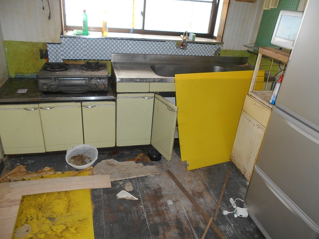 ・屋根の老朽化が原因と思われる雨漏りが台所で見受けられ、天井の一部が破損しています。