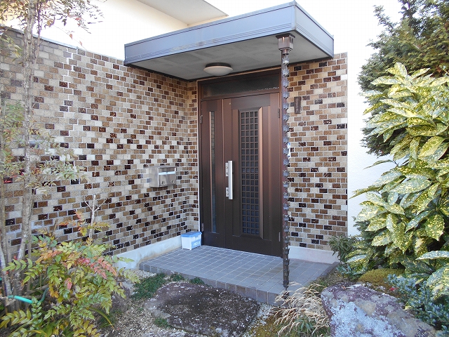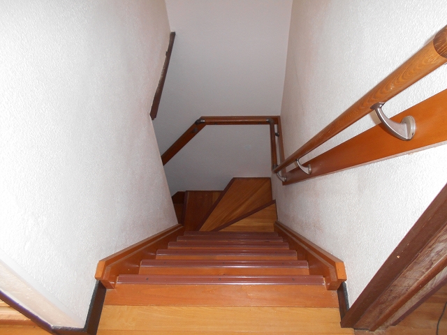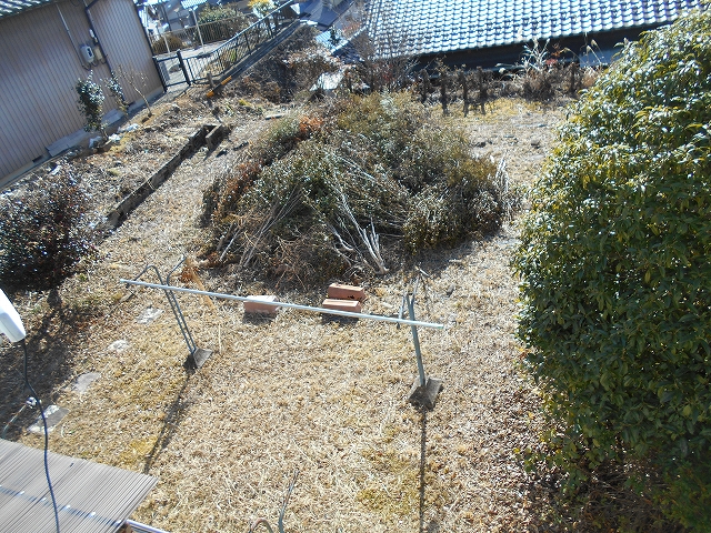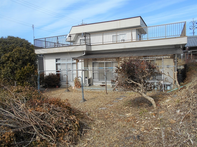 ・恵那駅から車で1.8㎞の南向きひな壇地形の広い敷地にある2階建て住宅です。玄関までのアプローチが三段の石階段を上がるようになっており、南側には広い庭、住宅東側の土地は6段の石段を登ると車庫兼倉庫と広めの菜園があります。