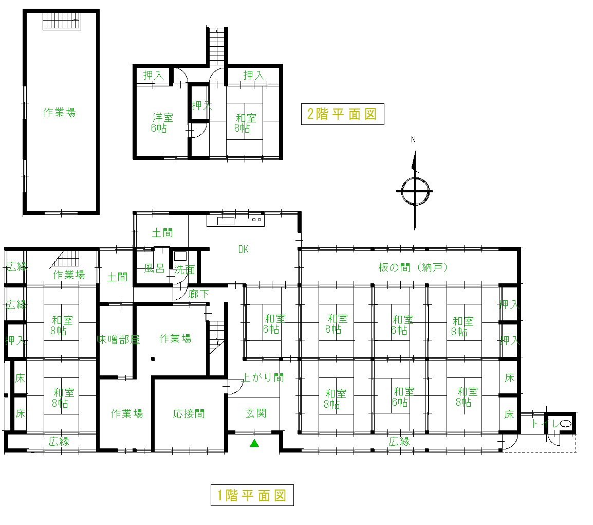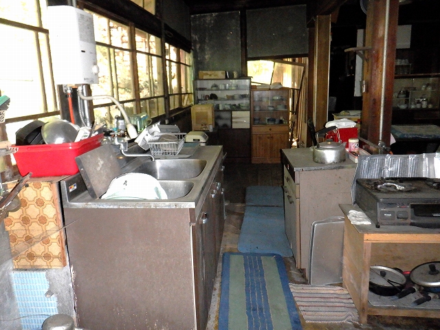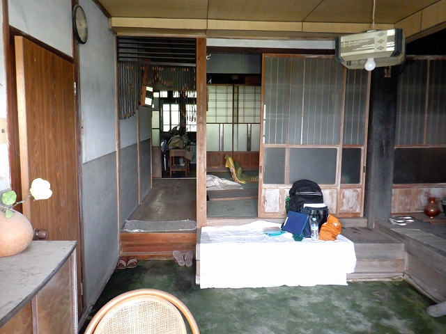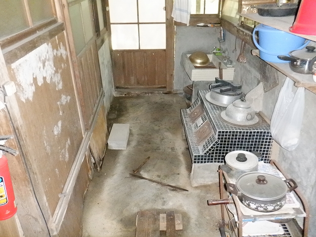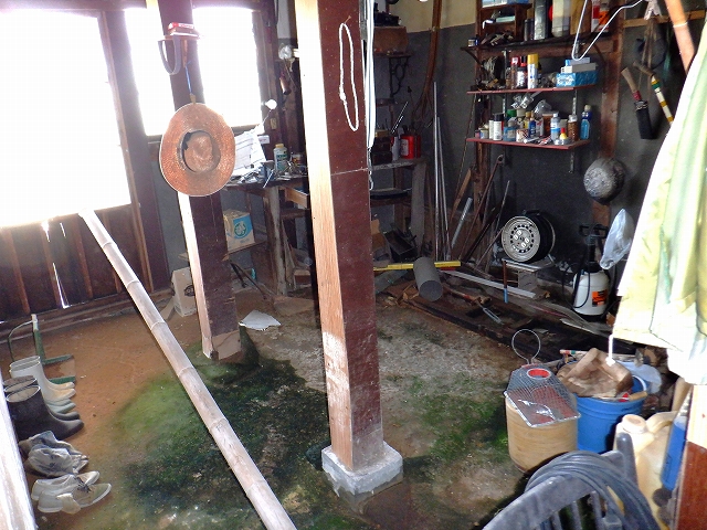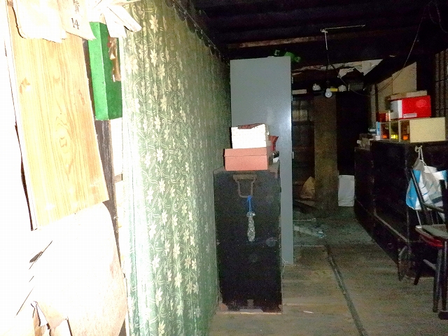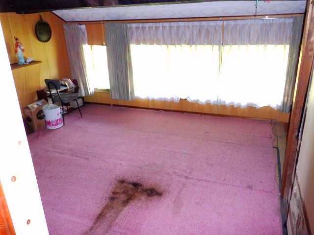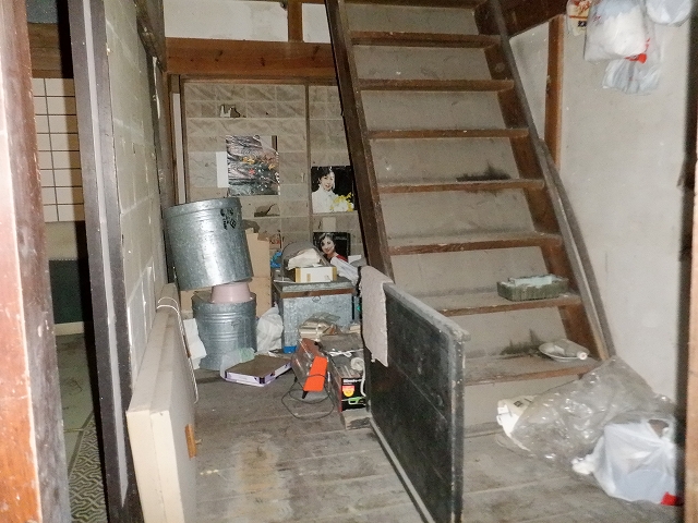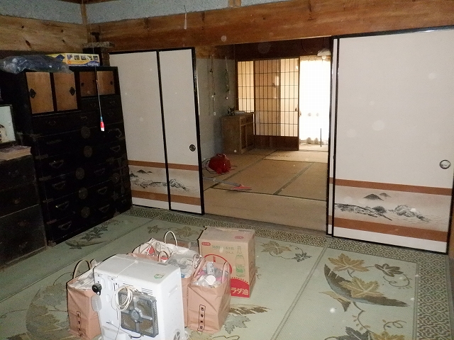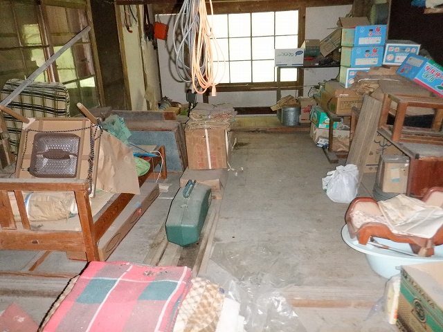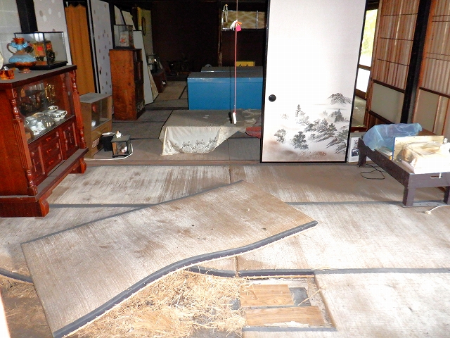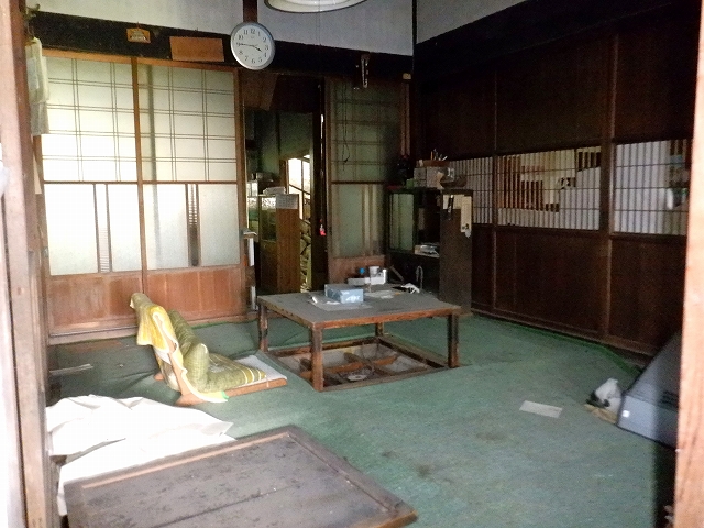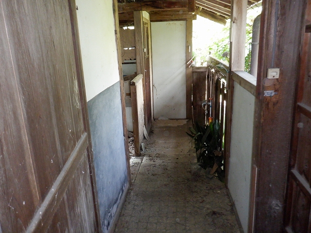 ・建物の状態は、母屋は屋根棟瓦に傷みが見られ雨漏りの形跡があります。室内では1階の床の大部分が劣化し、床抜けもあります。住むためには大がかりな修繕工事が必要です。別棟の建物で西側に隣接した馬屋は屋根が崩れ落ち、東端のトイは屋根が壊れて使用困難な状況です。