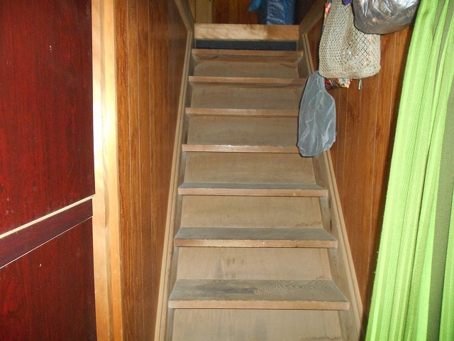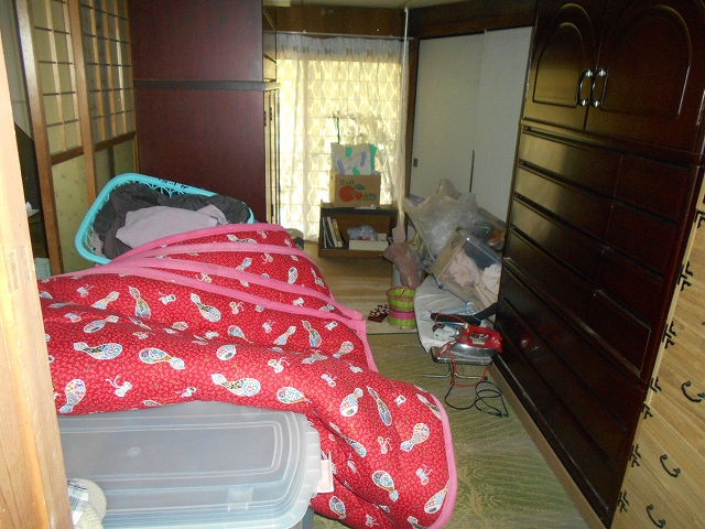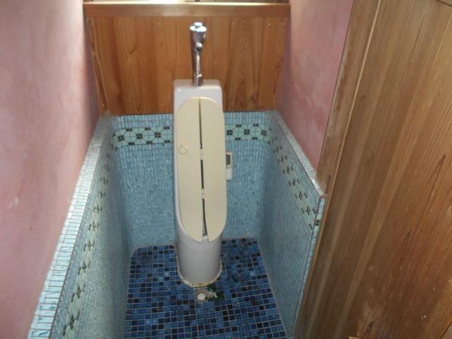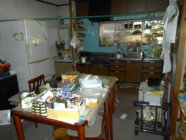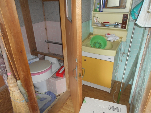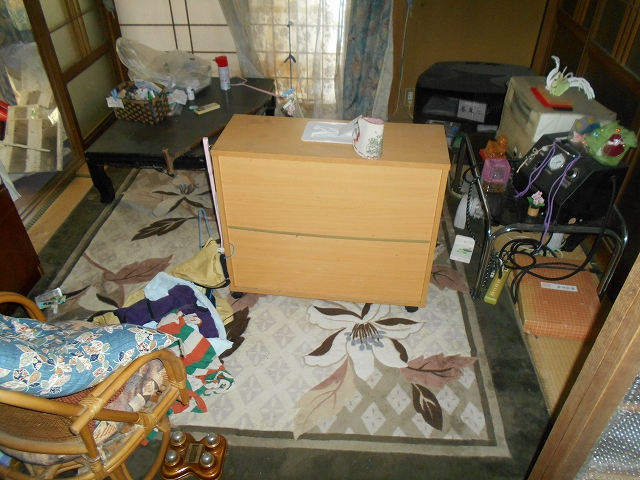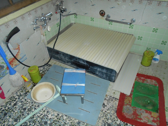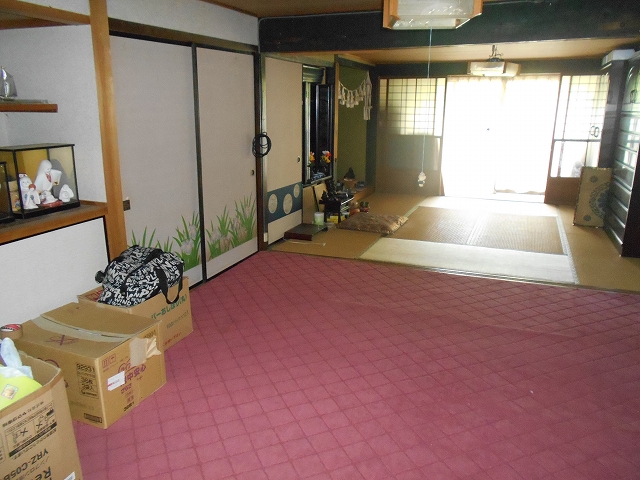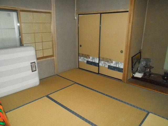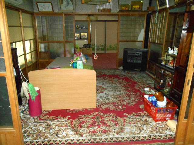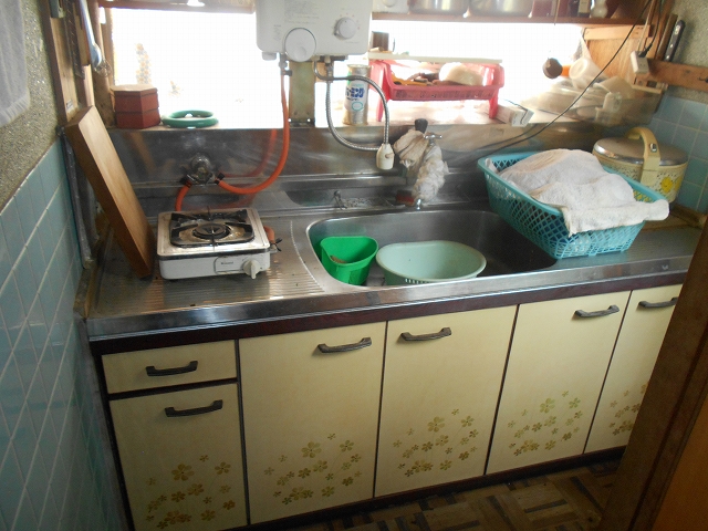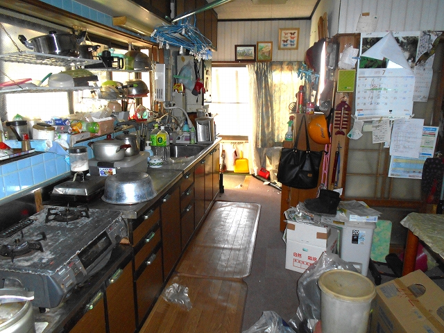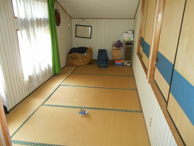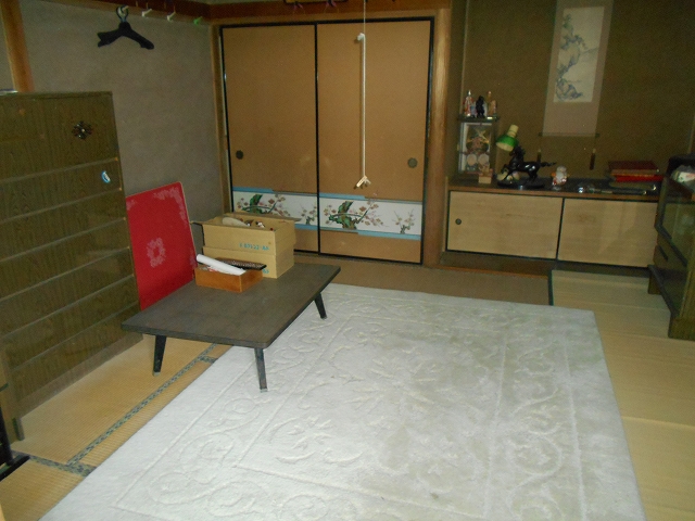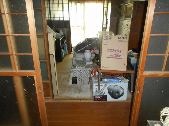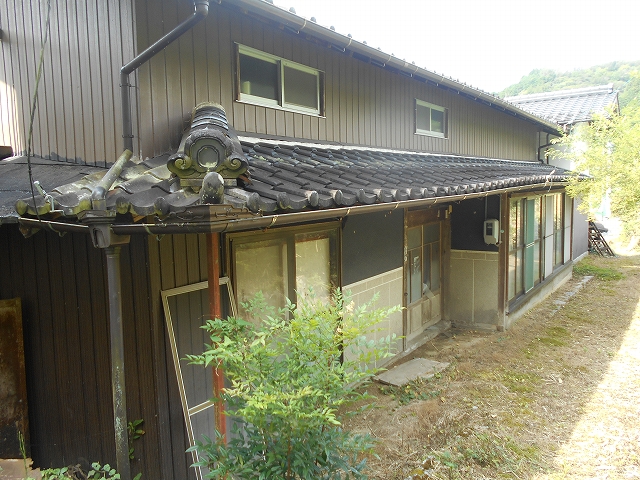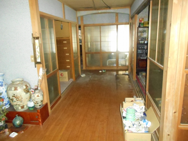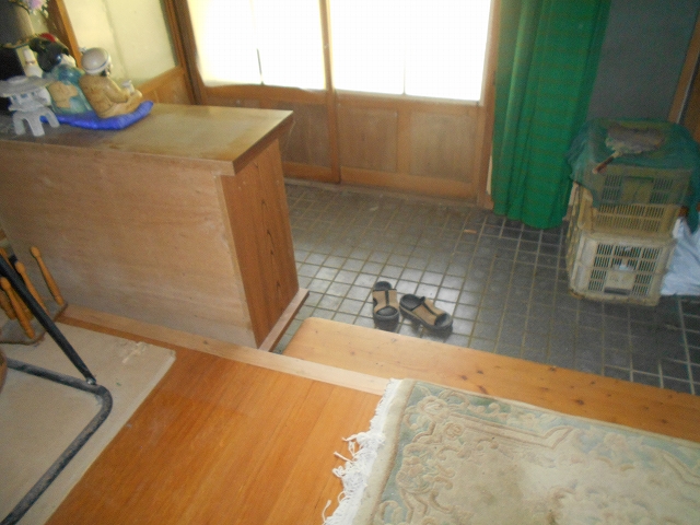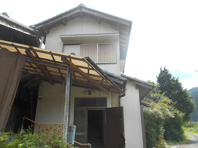 ・建物外部では、瓦屋根は葺き直しされきれいな状態ですが、室内のDK付近の天井が抜け落ちて仮補修されています。床面も一部で傷みがありそうです。