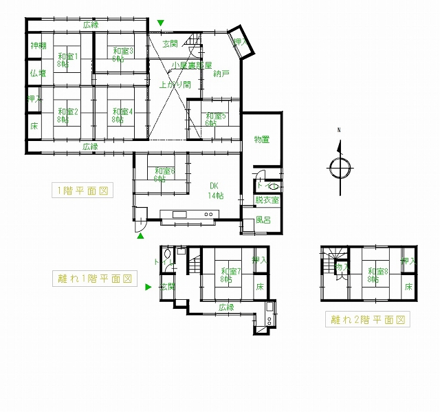 ・建物は大正15年建築の木造瓦葺き平屋建ての母屋、2階建て土蔵39.74㎡、鉄骨造平屋建て倉庫25.5㎡と2階建ての離れ55.76㎡の4棟が敷地内にあります。