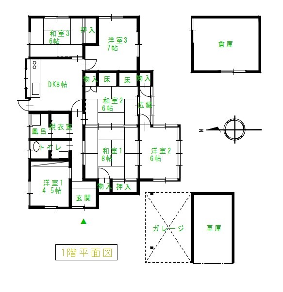 ・駅前から東に1kmほど離れた西向きのひな壇造成地の広い敷地に建つ木造平屋建住宅です。