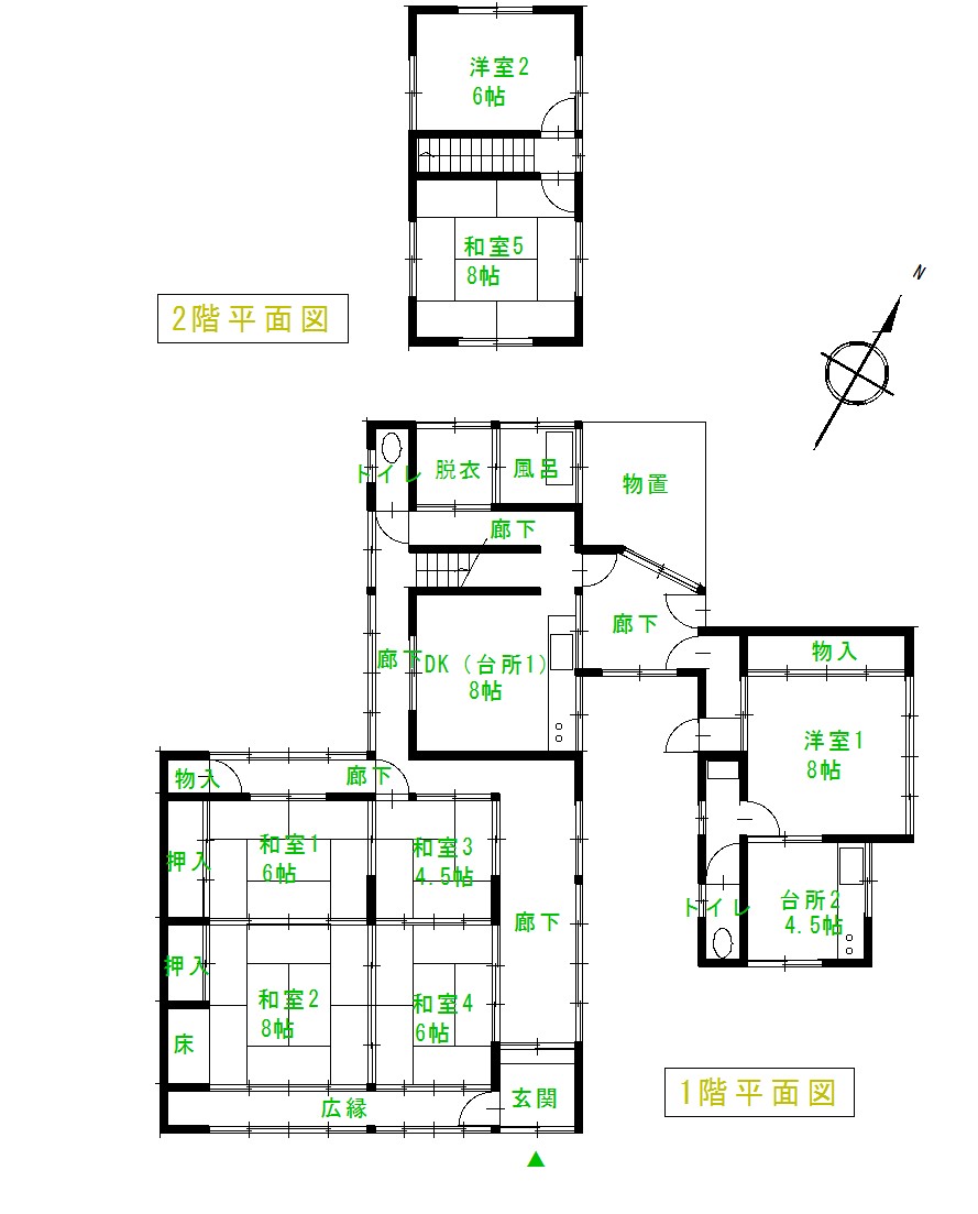 ・建物はもとの2階建て住宅に別棟の平家建て離れをつないだ形態で、6DK+1Kの大きさがあります。
