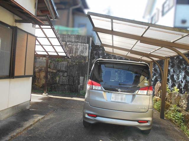 ・建物の南側に隣地の擁壁があり、建物との間を透明系の庇で覆い駐車スペースや作業スペースとして利用しています。建物自体は北西向きに主要な居室を配置し、笠置山方面の眺望を大切にしてあります。