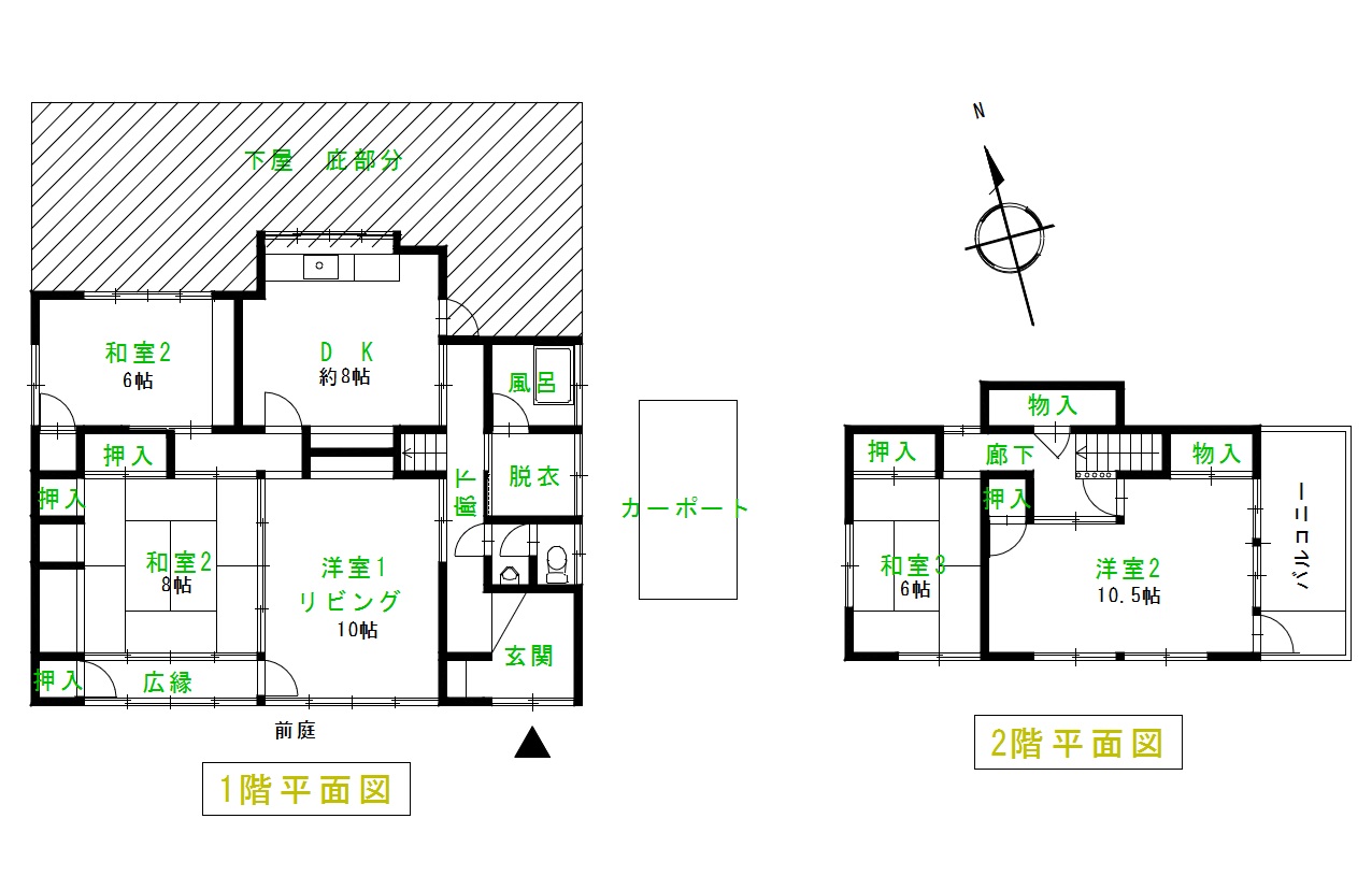 ・建物は5DK、木造2階建て瓦葺の母屋にカーポート付きで自動車は2台は容易に駐車できます。